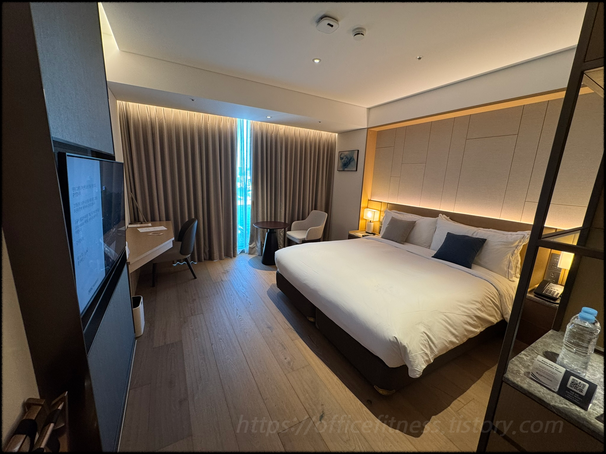 쭉 들어와서 룸을 살펴보면, 퀸 사이즈의 넉넉한 배드를 중심으로 테이블과 TV 등이 배치되어 있는 것을 보실 수 있습니다.