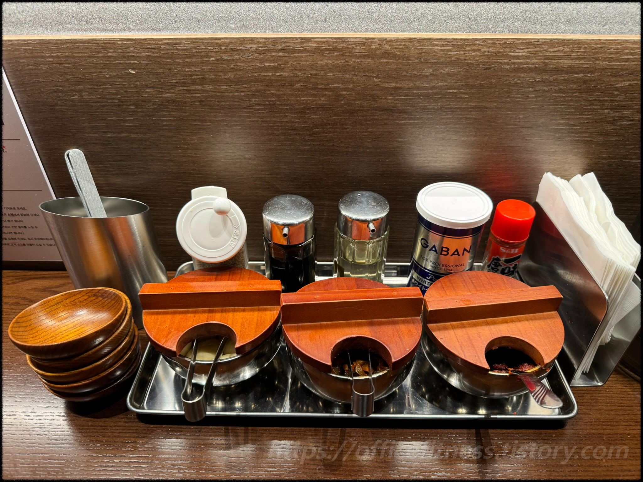 그리고 테이블에는, 이렇게 갖가지 양념류와 반찬류가 있습니다.