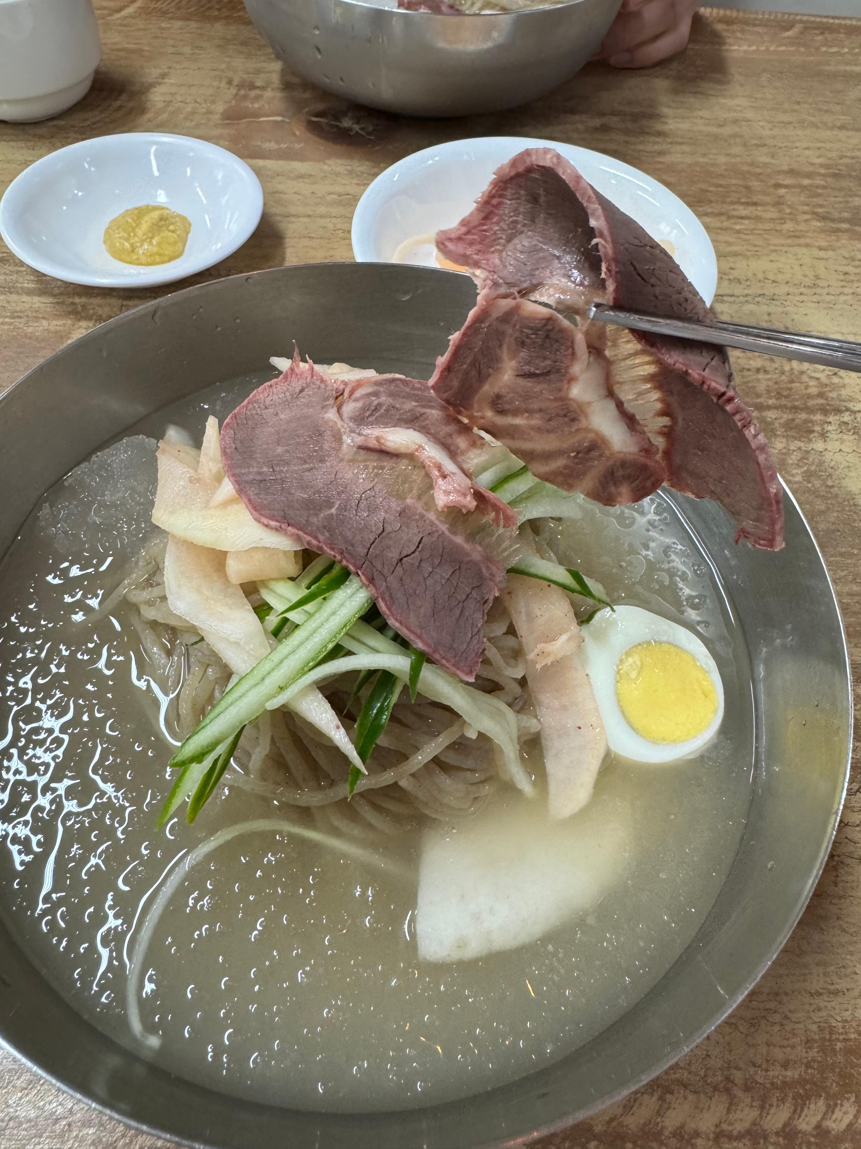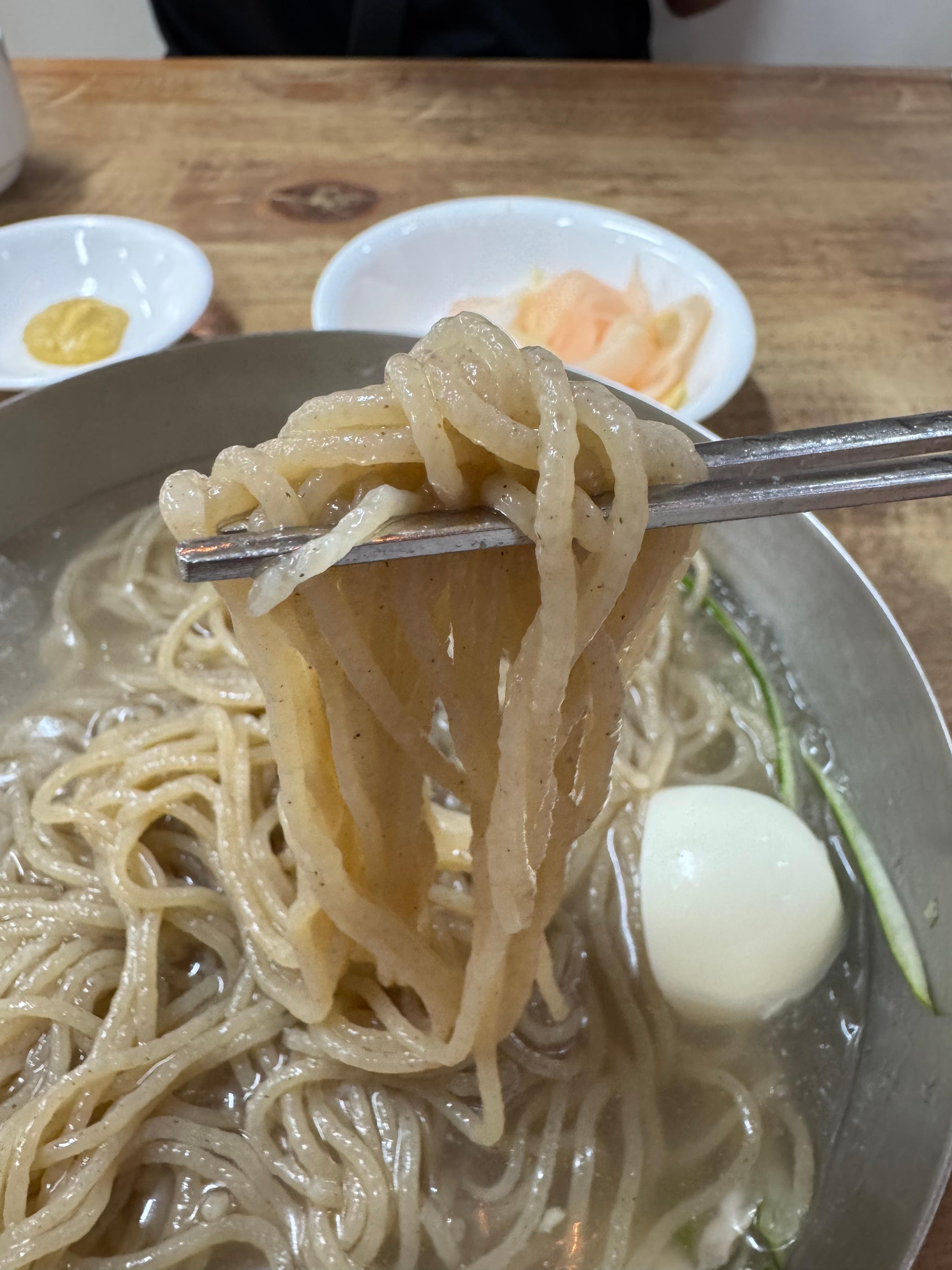 찬 육수에 담가져서 더욱 쫄깃한 느낌이 납니다.