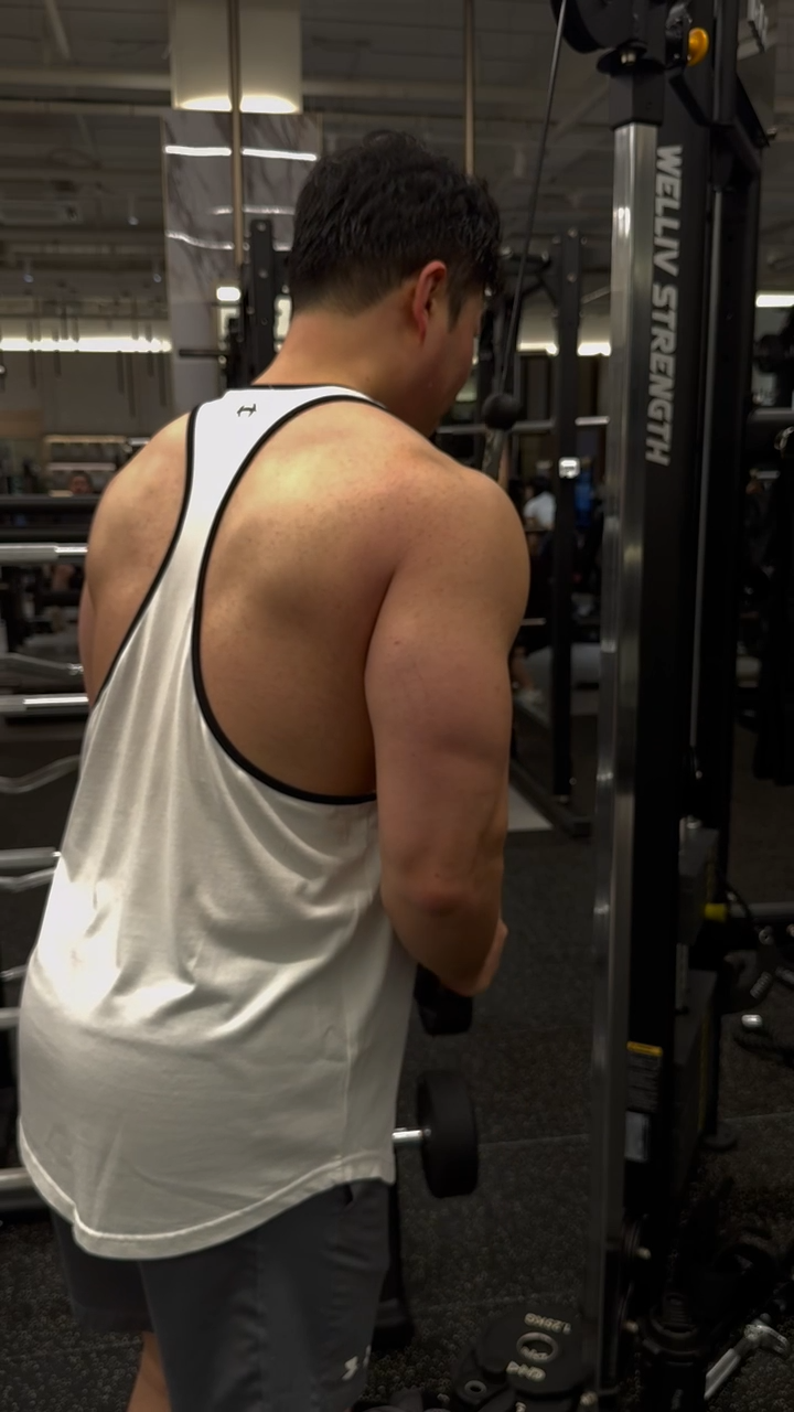 → 스트레이트 바 푸시다운은 직선 자극, 로프 푸시다운은 손목 벌림으로 삼두의 외측까지 더 강하게 자극됩니다.